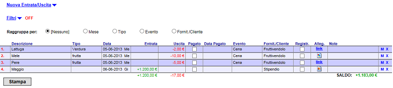 Da notare i campi "Tipo" (es: frutta, verdura, ecc.), "Evento" (es: compleanno, vacanza, ecc.) e "Fornit./Clienti" (es: negozio xxx) che contengono delle liste create dall'utente (nella pagina "Liste").